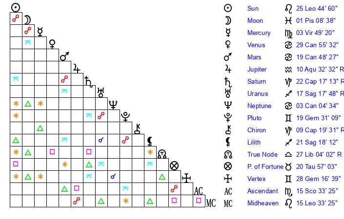 | Moon | 1 Pisces 15 | 12 Cancer 33 | 13 Virgo 55 |