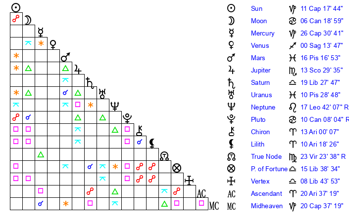 | Moon | 6 Cancer 17 | 2 Cancer 30 | 18 Aries 33 |
