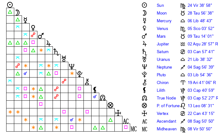 | Sun | 24 Virgo 39 | 25 Virgo 3 | 16 Scorpio 9 |