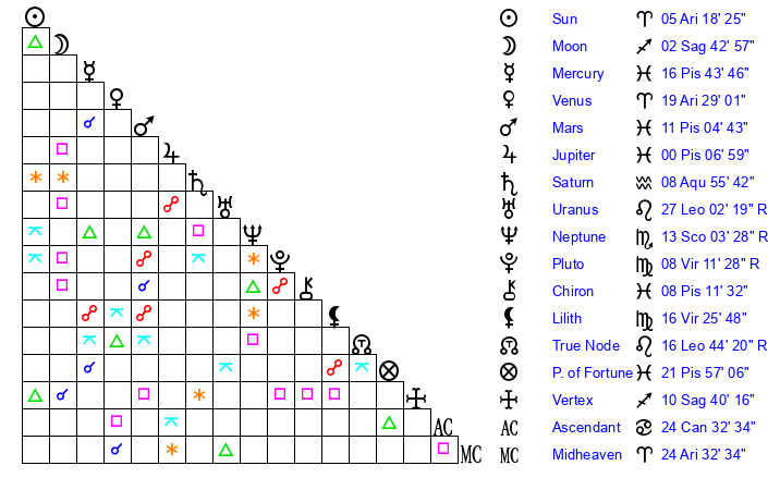 | Sun | 5 Aries 19 | 6 Aries 2 | 6 Gemini 38 |