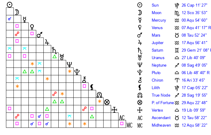 | Mercury | 0 Aquarius 55 | 12 Capricorn 9 | 27 Aquarius 12 |