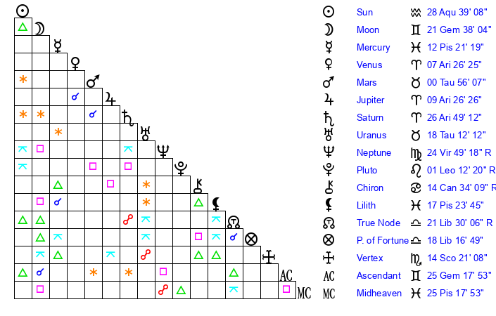 | Sun | 28 Aquarius 39 | 0 Pisces 2 | 22 Taurus 31 |