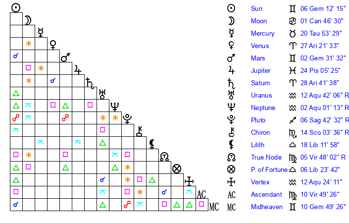 | Moon | 1 Cancer 48 | 14 Gemini 53 | 26 Gemini 0 |
