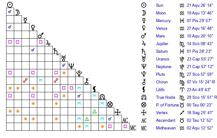 | Moon | 19 Aquarius 9 | 26 Cancer 7 | 4 Aries 55 |