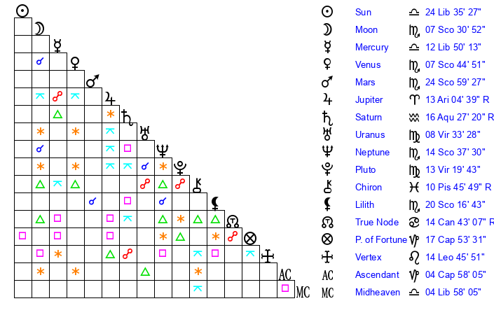 | Sun | 24 Libra 36 | 25 Libra 34 | 27 Sagittarius 4 |
