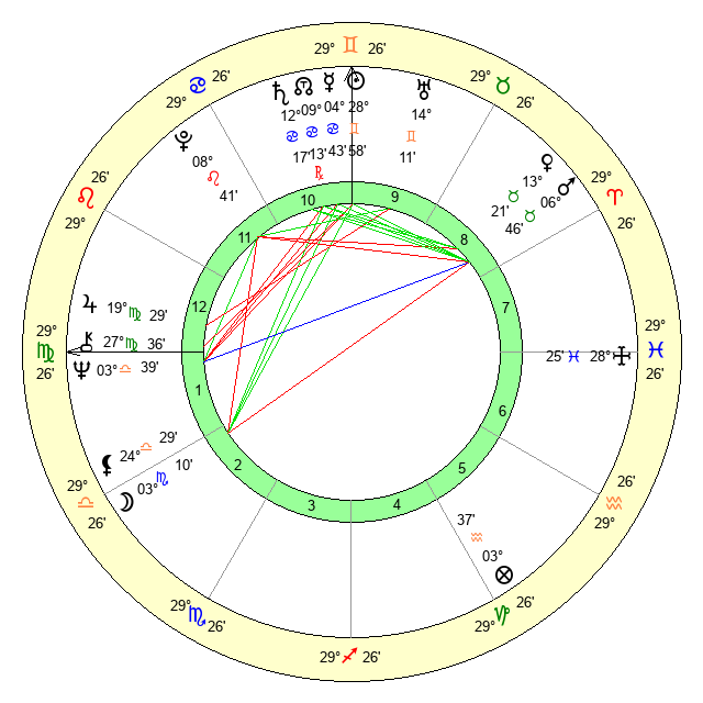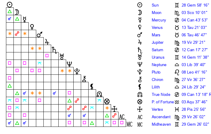 | Sun | 28 Gemini 59 | 29 Gemini 37 | 15 Virgo 40 |
