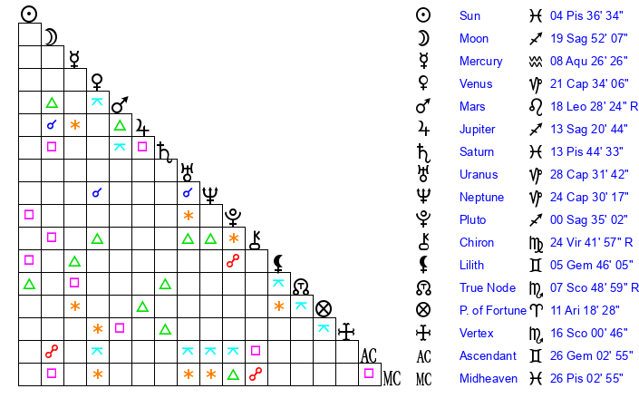 | Mercury | 8 Aquarius 26 | 17 Pisces 2 | 16 Pisces 42 |