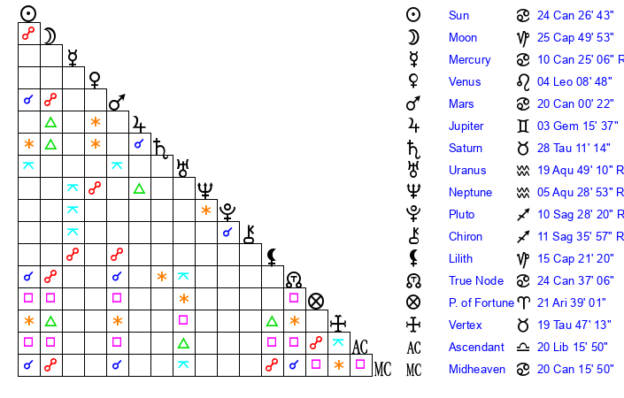 Moon | 25 Capricorn 52 | 7 Aries 7 | 29 Sagittarius 14 |