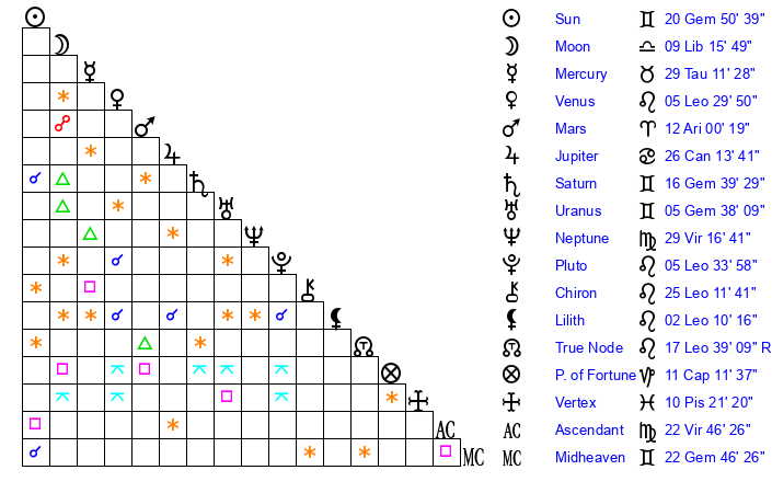 | Sun | 20 Gemini 51 | 21 Gemini 58 | 9 Virgo 21 |