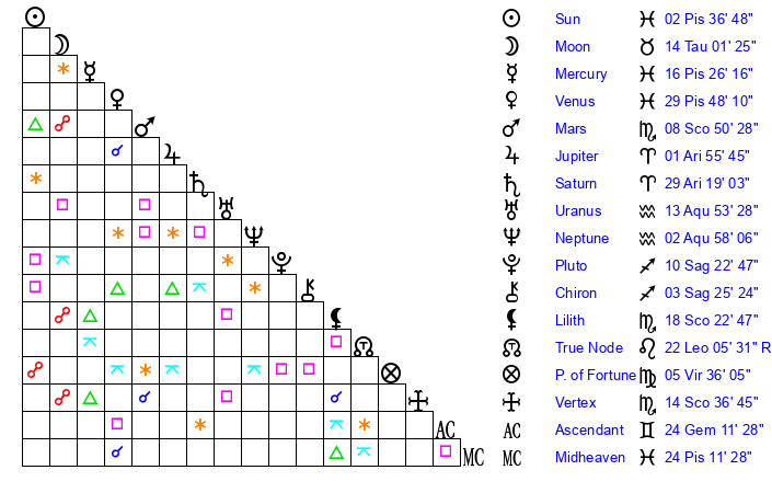 Sun | 2 Pisces 37 | 3 Pisces 19 | 28 Pisces 39 |