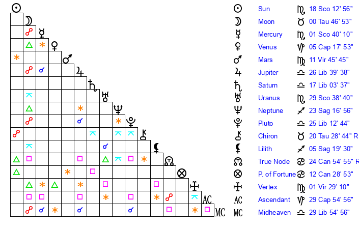 | Sun | 18 Scorpio 13 | 18 Scorpio 33 | 2 Capricorn 49 |