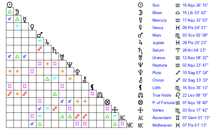 Sun | 16 Aquarius 27 | 17 Aquarius 9 | 12 Pisces 40 |