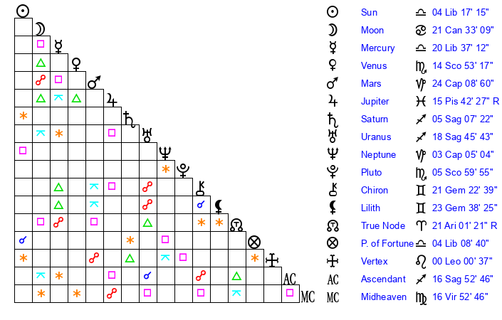Sun | 4 Libra 17 | 4 Libra 50 | 12 Scorpio 59 |