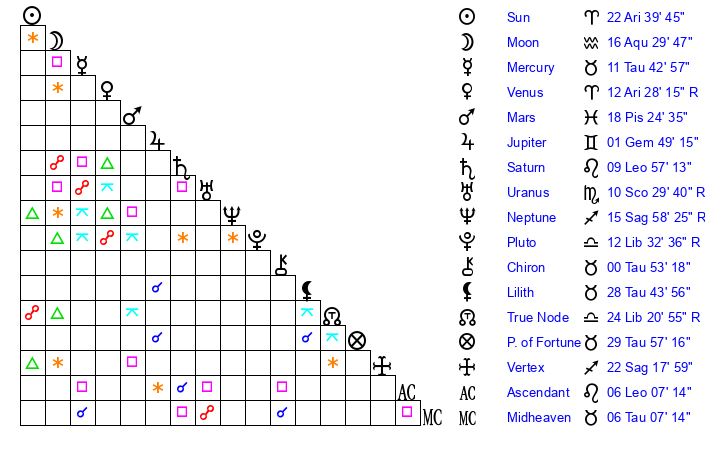 | Sun | 22 Aries 40 | 23 Aries 2 | 9 Gemini 9 |