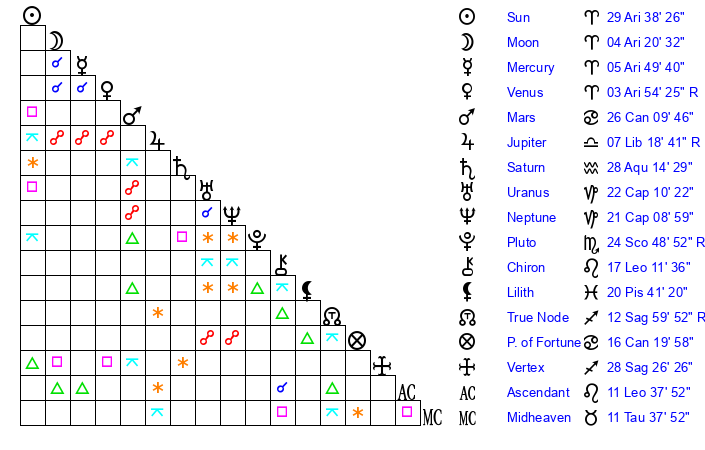 | Venus | 3 Aries 54 | 25 Pisces 29 | 16 Aries 38 |