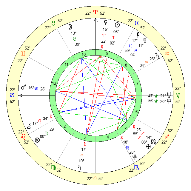 | Moon | 13 Taurus 43 | 28 Aquarius 29 | 14 Cancer 28 |