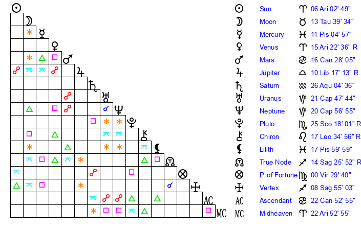 | Moon | 13 Taurus 43 | 28 Aquarius 29 | 14 Cancer 28 |