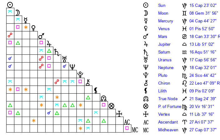 | Sun | 15 Capricorn 22 | 15 Capricorn 22 | 18 Aquarius 56 |