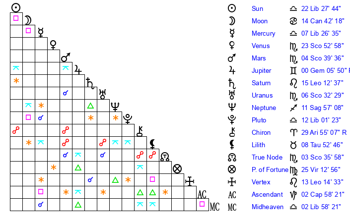 | Venus | 23 Scorpio 53 | 2 Libra 15 | 23 Capricorn 5 |