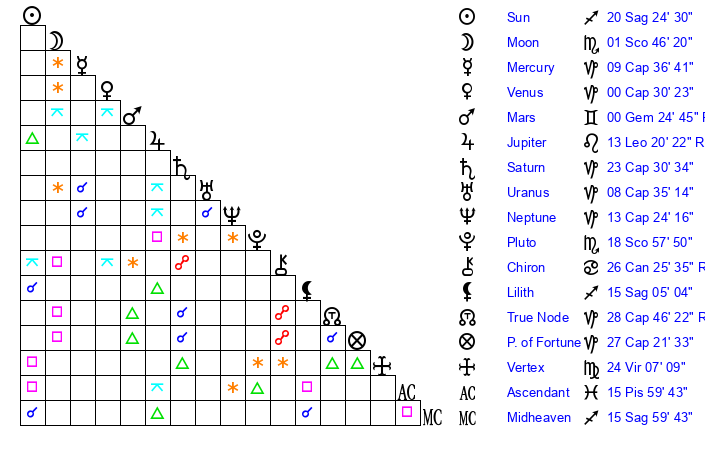 | Saturn | 23 Capricorn 33 | 25 Pisces 15 | 27 Capricorn 32 |