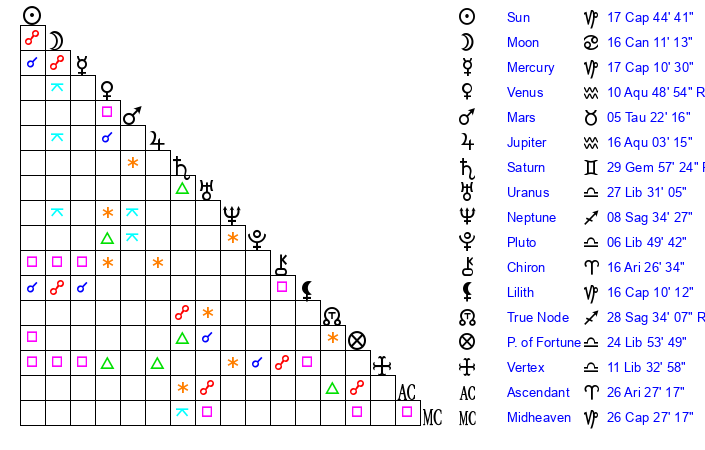 Jupiter | 15 Aquarius 55 | 12 Gemini 29 | 27 Aquarius 58 |