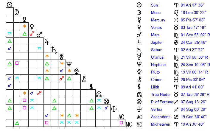 Pluto | 19 Virgo 0 | 3 Aquarius 23 | 18 Virgo 0 |