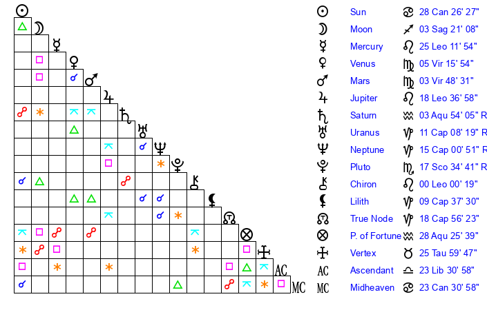 | Moon | 3 Sagittarius 26 | 18 Gemini 17 | 23 Aquarius 31 |