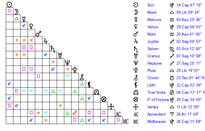 | Sun | 14 Capricorn 47 | 15 Capricorn 22 | 28 Aquarius 28 |