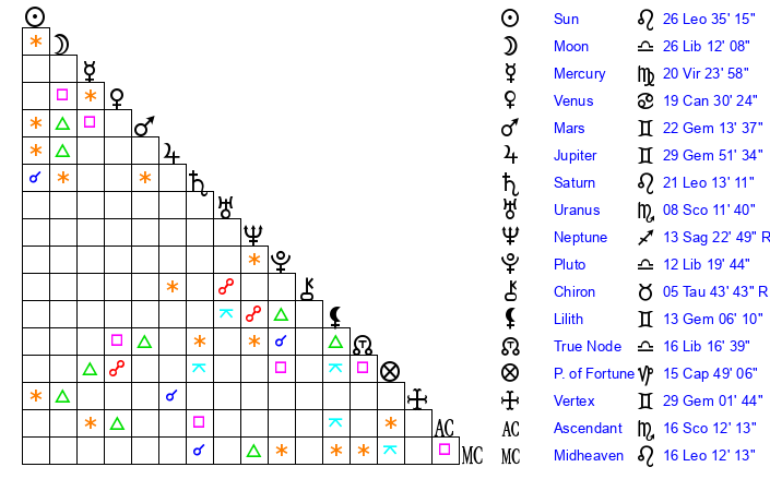 | Moon | 26 Libra 12 | 12 Cancer 33 | 27 Cancer 55 |
