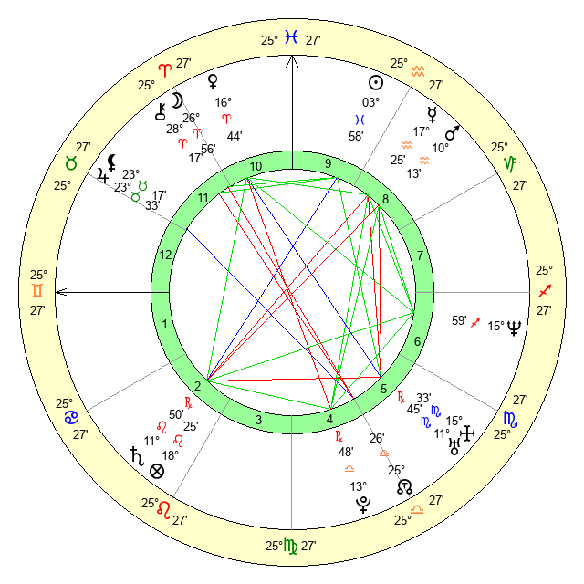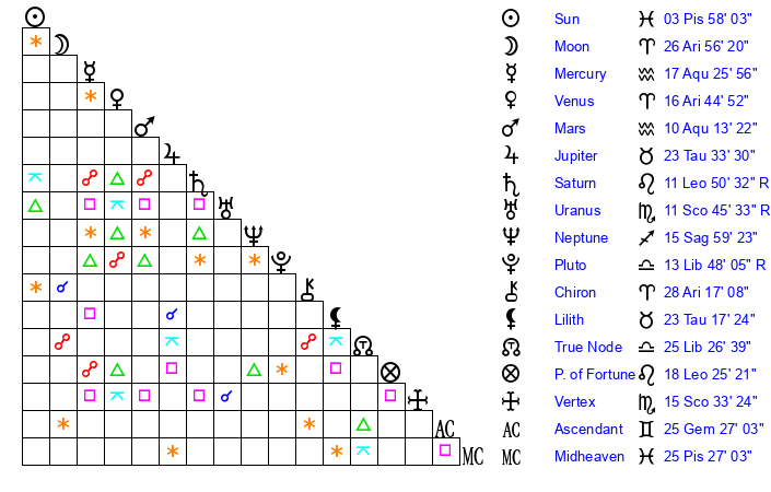 | Moon | 26 Aries 53 | 26 Sagittarius 33 | 3 Aquarius 10 |