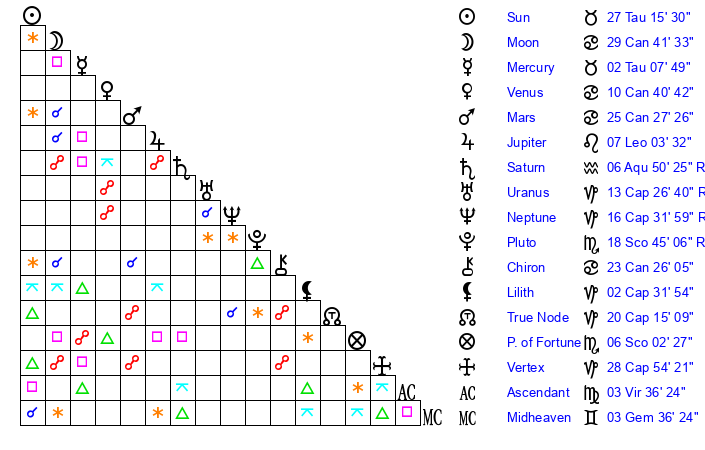 | Moon | 29 Cancer 43 | 6 Aquarius 4 | 29 Libra 53 |