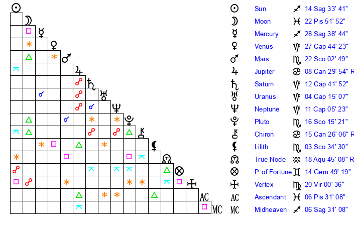 | Sun | 14 Sagittarius 33 | 14 Sagittarius 49 | 21 Capricorn 13 |