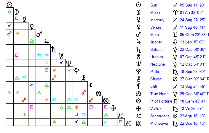 | Sun | 5 Sagittarius 11 | 5 Sagittarius 42 | 10 Capricorn 46 |