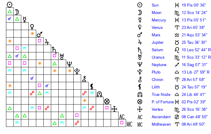 | Moon | 12 Scorpio 9 | 26 Cancer 47 | 7 Leo 17 |