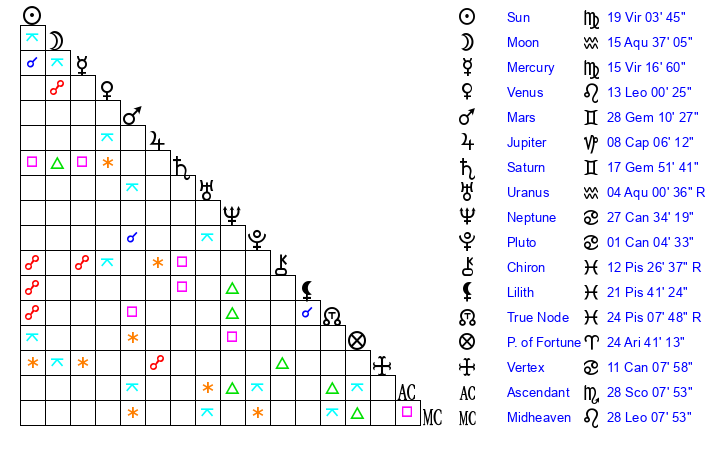 | Mercury | 15 Virgo 17 | 19 Virgo 3 | 27 Sagittarius 57 |