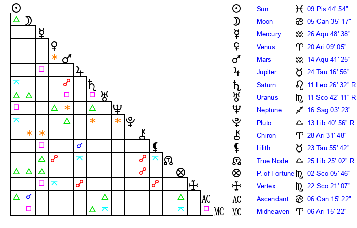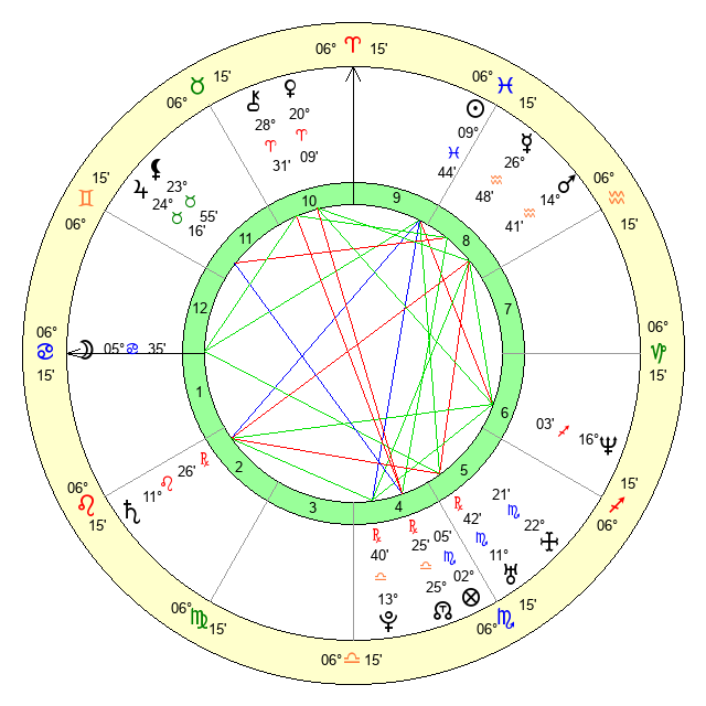 | Moon | 5 Cancer 26 | 15 Pisces 52 | 16 Aries 14 |