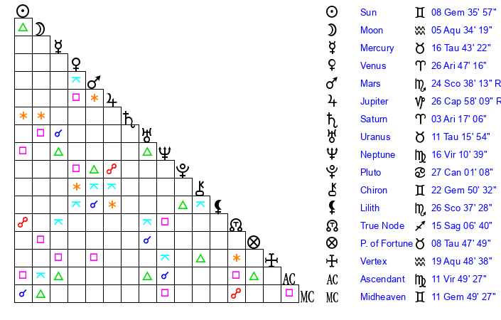 | Sun | 8 Gemini 36 | 9 Gemini 18 | 2 Virgo 46 |