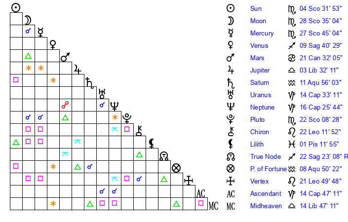 | Sun | 4 Scorpio 31 | 4 Scorpio 32 | 7 Sagittarius 44 |