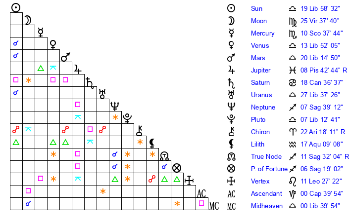 | Uranus | 27 Libra 40 | 0 Gemini 54 | 0 Scorpio 43 |