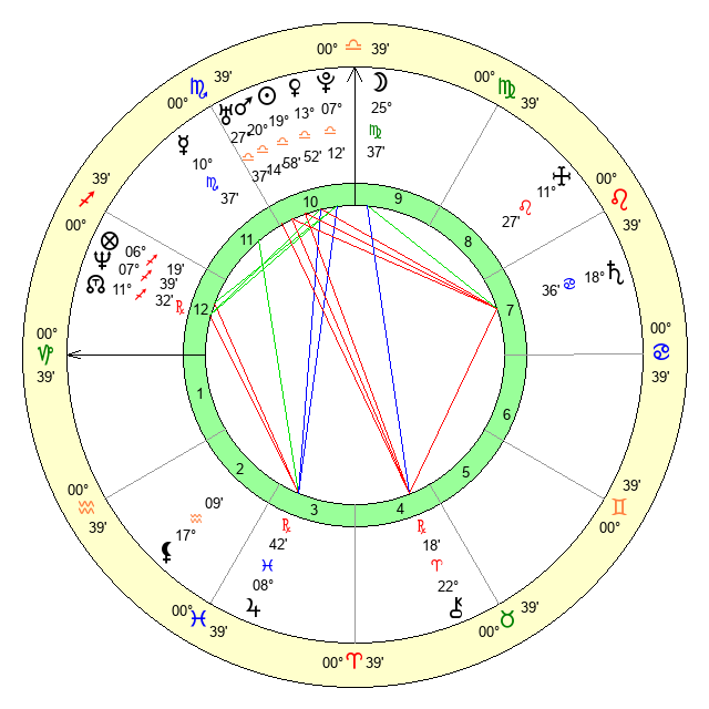 | Moon | 25 Virgo 36 | 19 Cancer 52 | 4 Leo 51 |