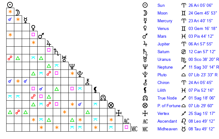 | Sun | 26 Aries 5 | 26 Aries 57 | 14 Gemini 24 |