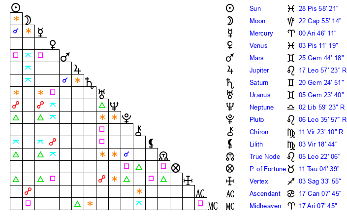 Sun | 28 Pisces 58 | 29 Pisces 20 | 17 Gemini 45 |