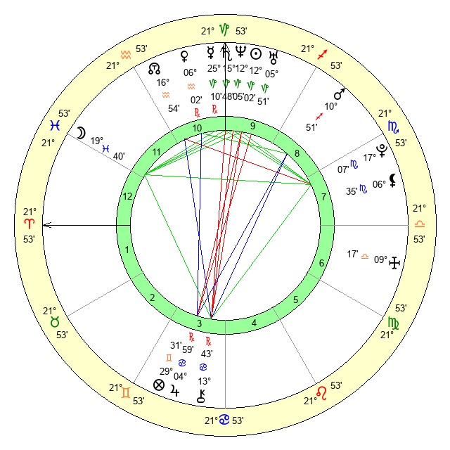 | Moon | 19 Pisces 41 | 2 Cancer 30 | 22 Cancer 44 |