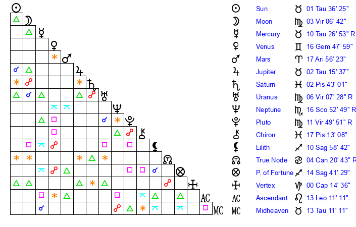 | Sun | 1 Taurus 36 | 1 Taurus 50 | 0 Cancer 19 |