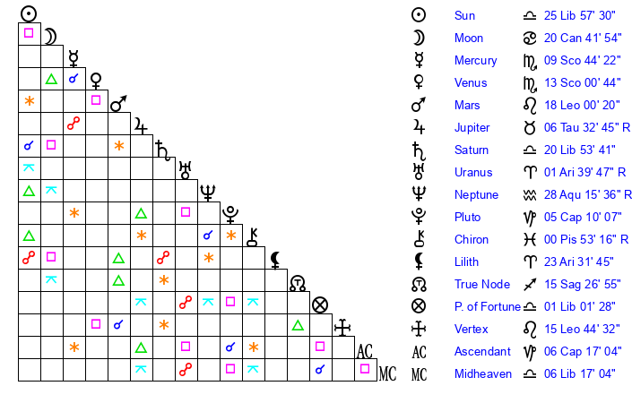 Sun | 25 Libra 57 | 26 Libra 48 | 8 Scorpio 55 |
