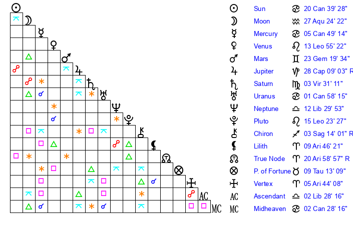 Sun | 20 Cancer 42 | 21 Cancer 19 | 4 Libra 0 |