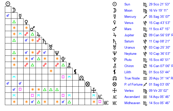 | Moon | 16 Virgo 20 | 15 Sagittarius 11 | 0 Capricorn 59 |