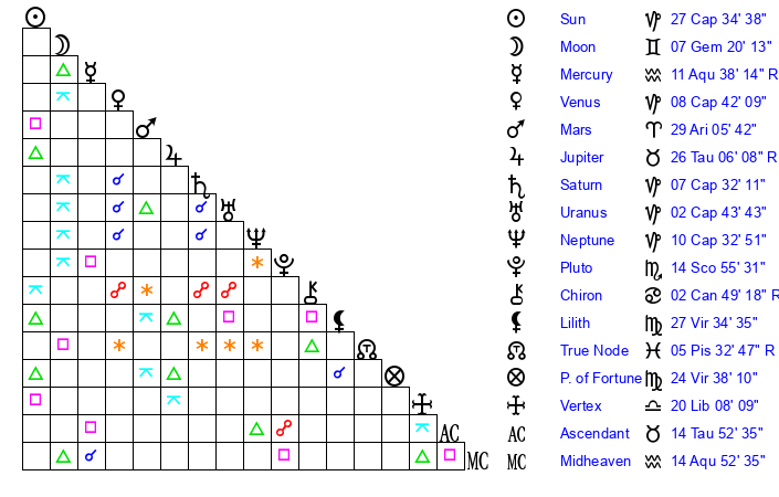 | Venus | 8 Capricorn 42 | 14 Pisces 48 | 23 Aquarius 45 |