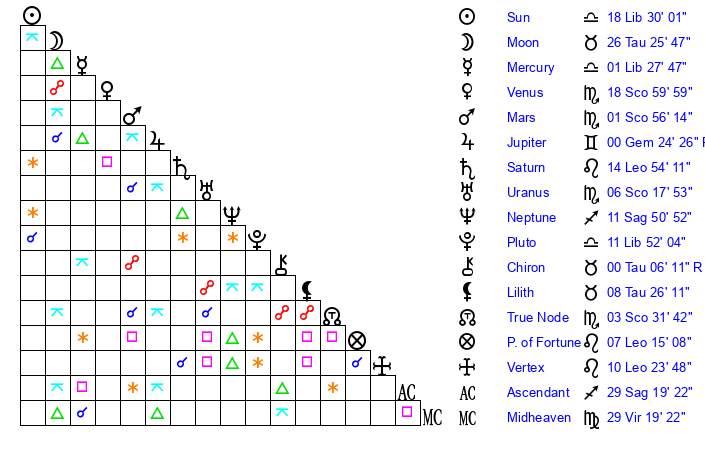 | Moon | 26 Taurus 26 | 21 Gemini 40 | 21 Pisces 0 |