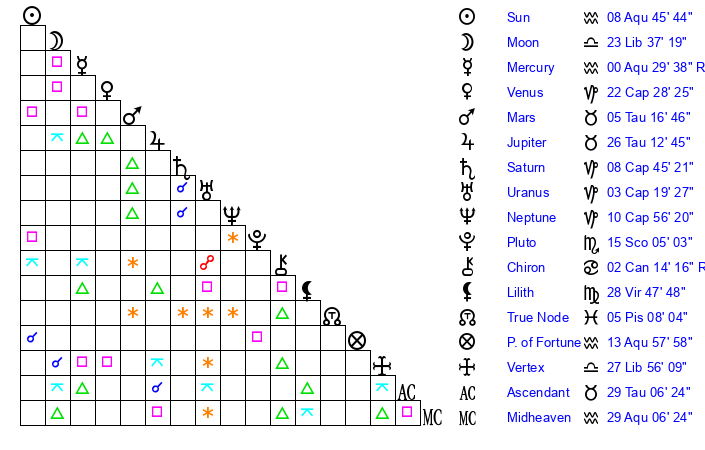| Venus | 22 Capricorn 28 | 24 Pisces 45 | 7 Pisces 30 |